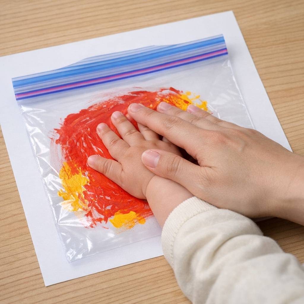 手型を取りたい画用紙の上にジップロックをのせて絵の具を塗り、その上に赤ちゃんの手を広げて優しく押さえます。