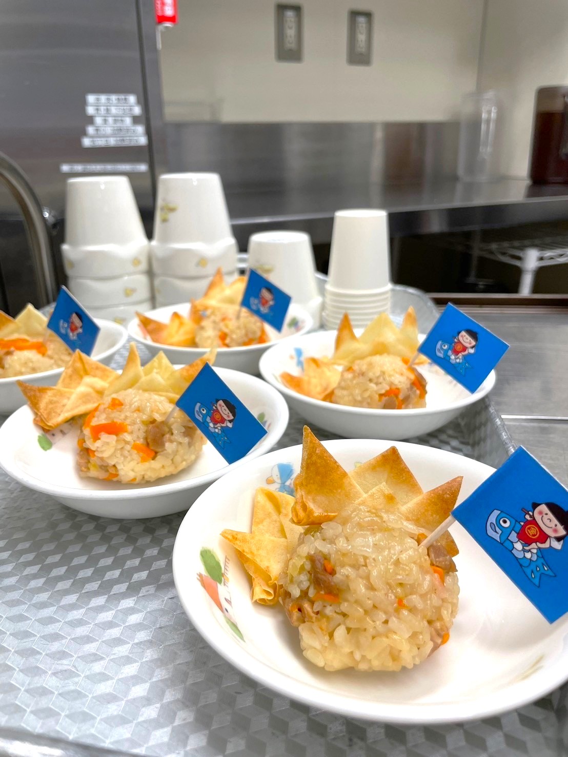 兜チップは、春巻きの皮を使って兜の形に折り、揚げてパリッとした食感に仕上げています。シンプルな材料で作ることができ、見た目も可愛らしいため、行事のおやつやご家庭でも楽しめる一品です。ちまきおにぎりと一緒に盛り付けることで、こどもの日らしい雰囲気をより感じられるおやつになりました。