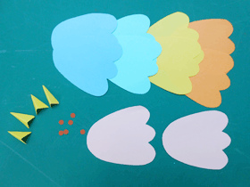 色画用紙で羽根、くちばし、目等のパーツを作る。
