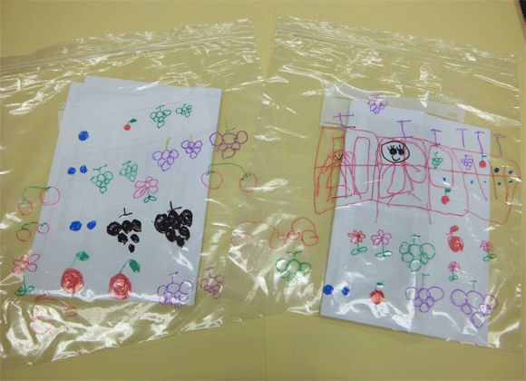 乳児には、大きい子どもたちが絵や模様を描いて、新学期のプレゼントにすると喜ばれる。