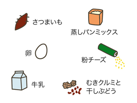 材料(6コ分):さつまいも 6切(1/2本)、蒸しパンミックス 200g(又はホットケーキミックス)、卵 1コ、牛乳又は水 大さじ3~4、粉チーズ 少々、むきクルミと干しぶどう